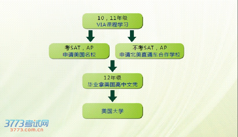 VIA国际课程的目标是让所有的学生能申请到美国一流大学,强调学业与综合素质能力方面的培养,强化对学生的学业规划和职业规划指导。学校和众多美国一流大学保持合作伙伴关系,以确保毕业学生能够优先被美国名校录取。毕业学生升学的途径包括: