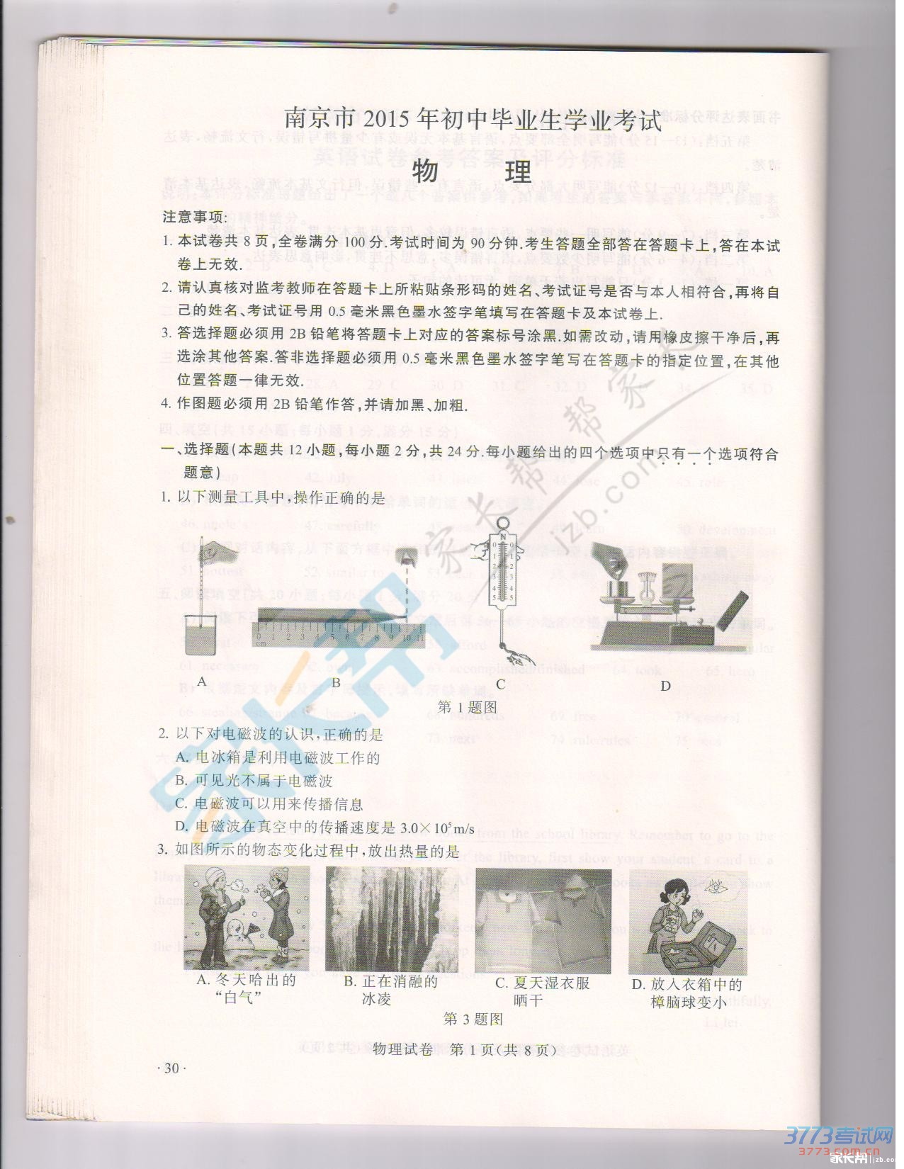 公布南京中考试题、答案和中考作文。祝各位考生都能取得好的成绩。2015年江苏南京中考物理试题及答案(图片版):