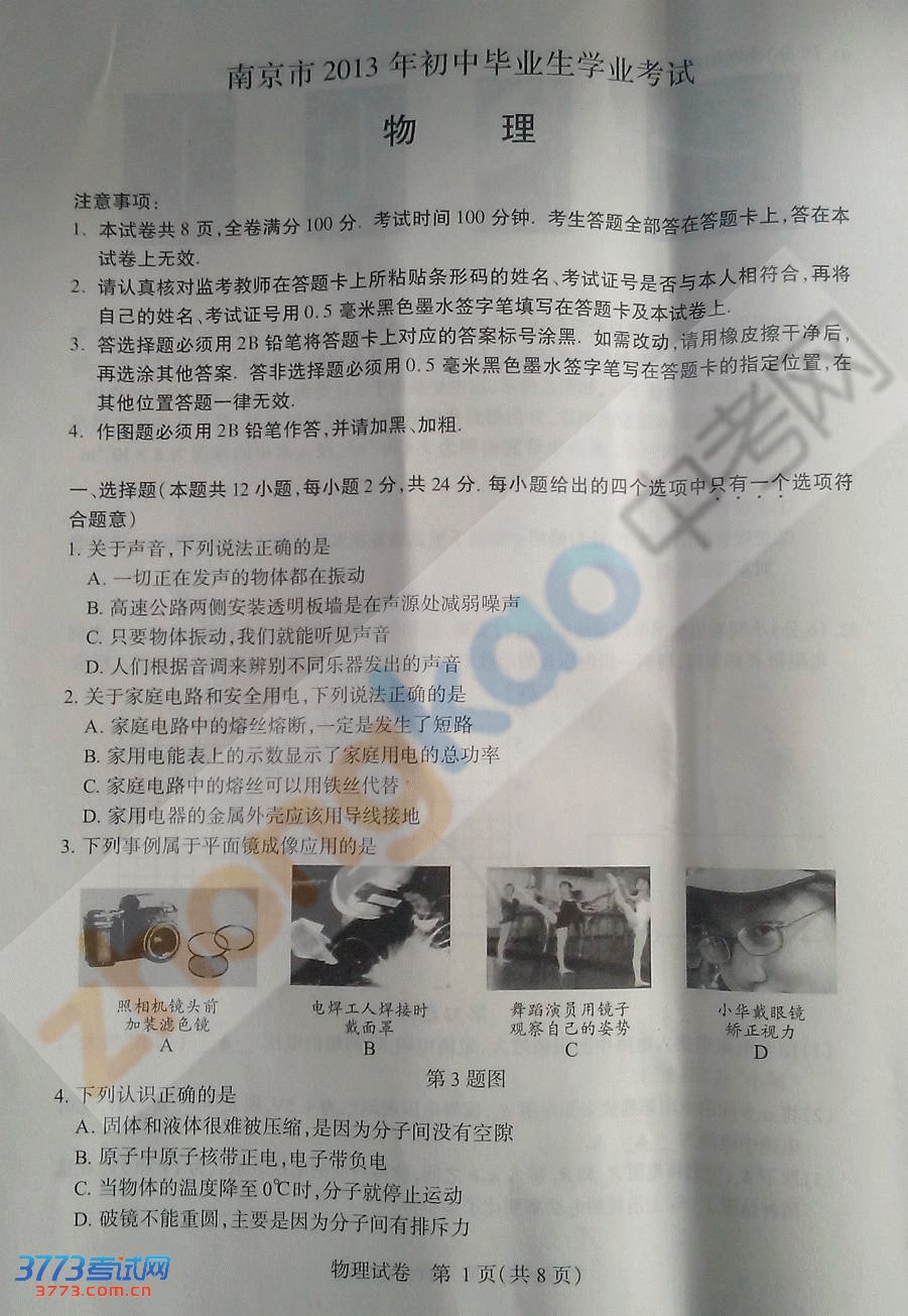 [图文]2013南京中考物理试卷试题