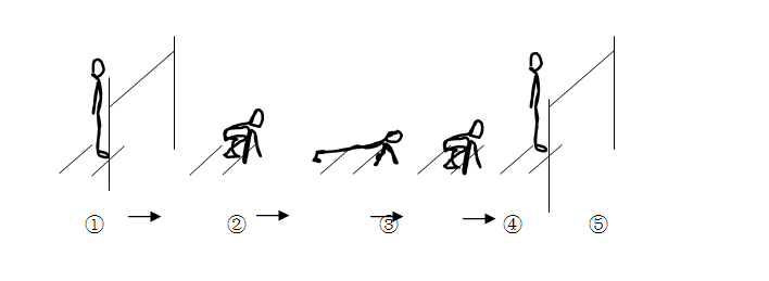在塑胶场地上进行;考生站立于指定的区域内,当听到“开始(或哨声)”口令后(开表计时),迅速成蹲撑,两脚同时后伸,脚点地后即迅速收腿成蹲撑起立,起立后,再进行下一个动作的重复;记录30秒内完成的有效次数。