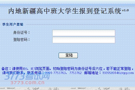 备注:请使用IE6、IE7浏览页面。初始登陆密码为身份证号后六位,若不能正常登陆,请与我们联系。联系电话:0991-7753763、7753762   邮箱地址:1939589146@qq.com