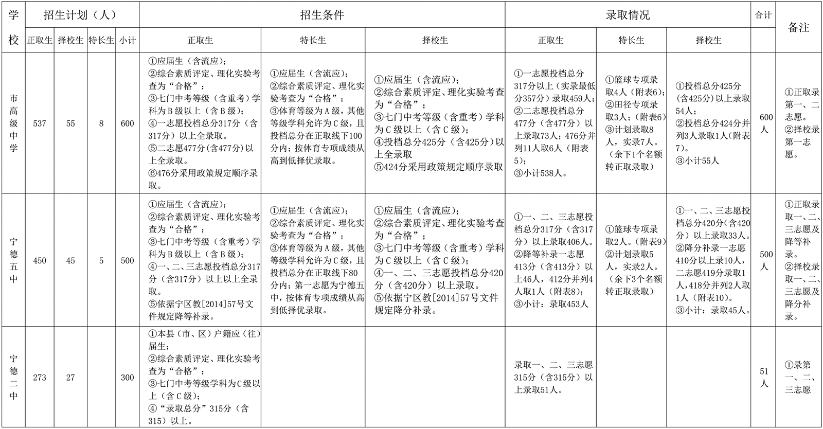 2014年市高级中学、宁德五中高一新生录取情况说明