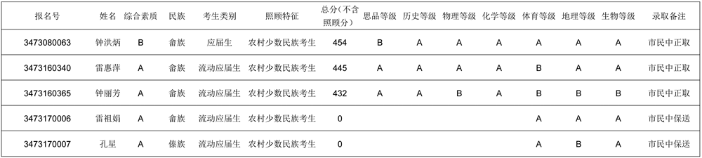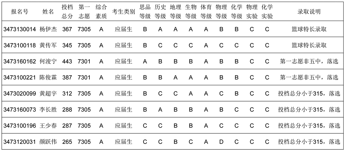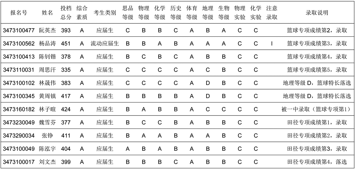 注:高级中学计划招收特长生8名(其中篮球专项5人、田径专项3人)。实际录取7人,(其中篮球专项4人、田径专项3人)。