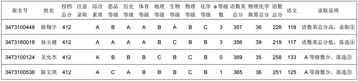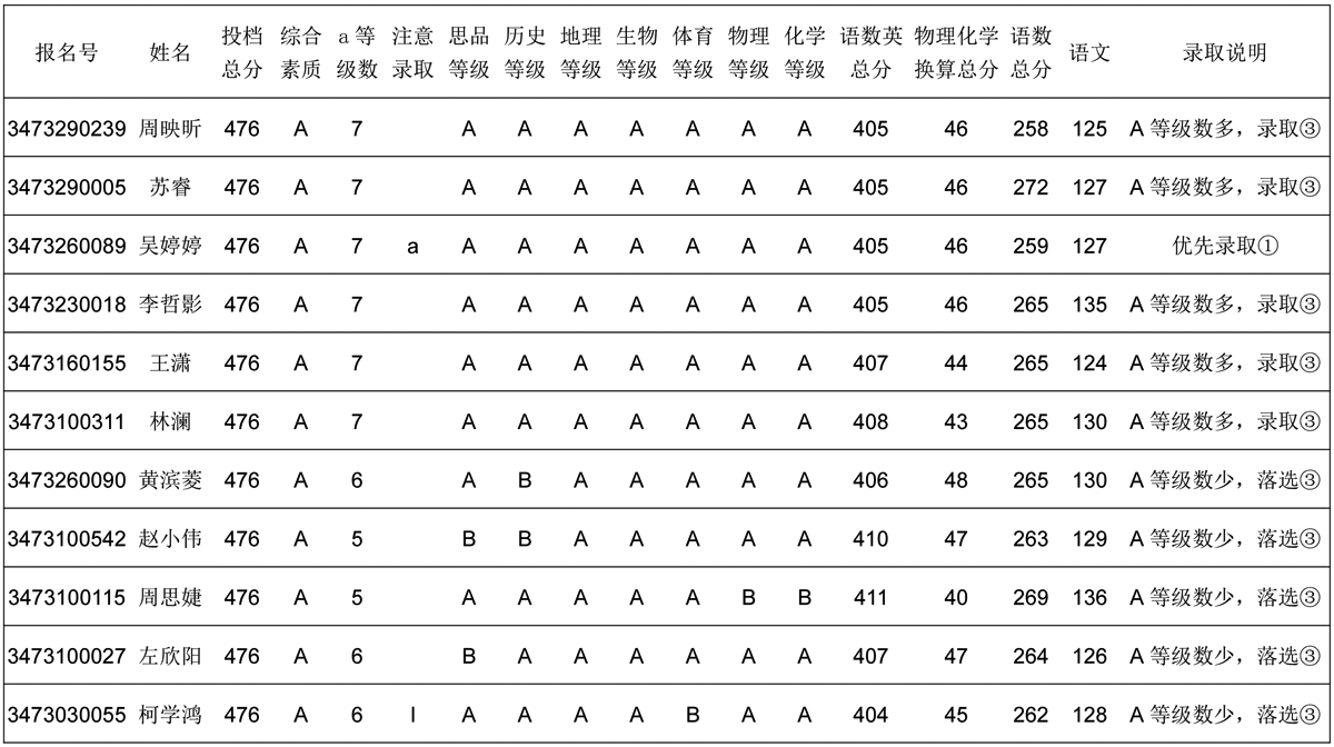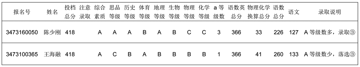 三、在“录取总分”相同的情况下,按以下顺序优先录取(一)享受政策照顾中“在同等条件下优先录取”的考生;(二)综合素质评定等级在前的考生;(三)A等级学科多的考生;(四)语文、数学、英语三科总分高的考生;(五)物理和化学换算总分高的考生; (六)语文和数学总分高的考生;(七)语文学科成绩高的考生。