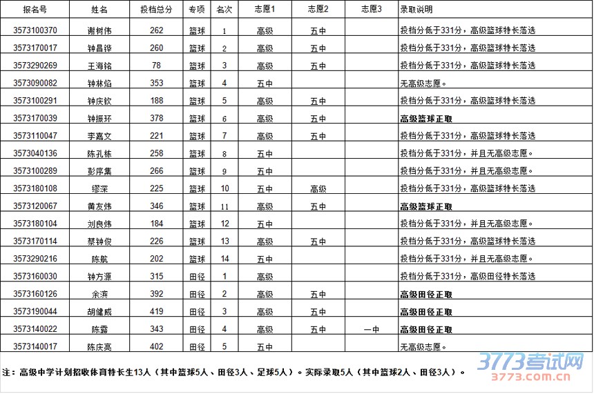 2-3  高级中学特长生录取说明(投档总分>=331分)(表5)