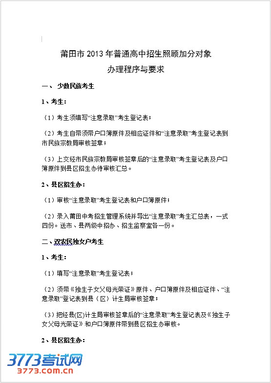 莆田市2013年普通高中招生照顾加分对象办理程序与要求