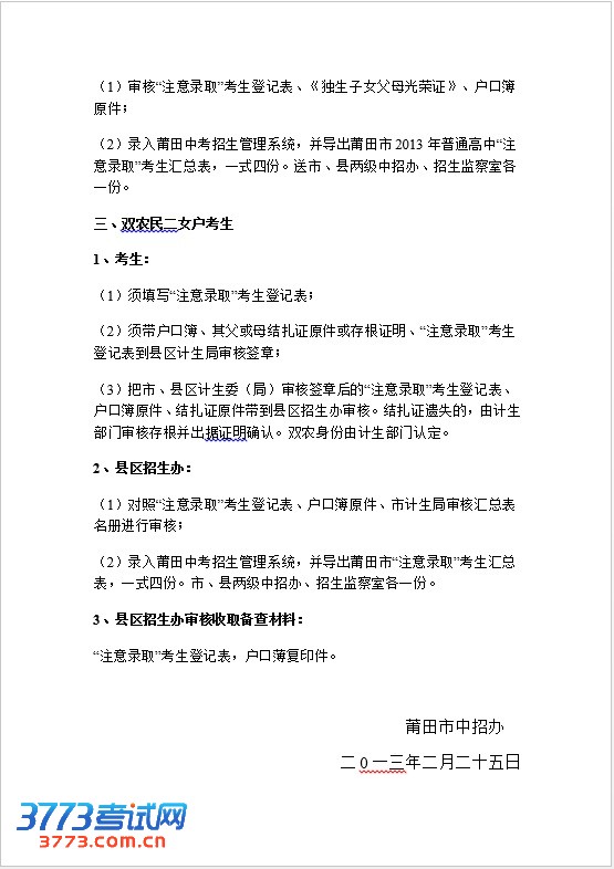 (2)录入莆田中考招生管理系统,并导出莆田市2013年普通高中“注意录取”考生汇总表,一式四份。送市、县两级中招办、招生监察室各一份。