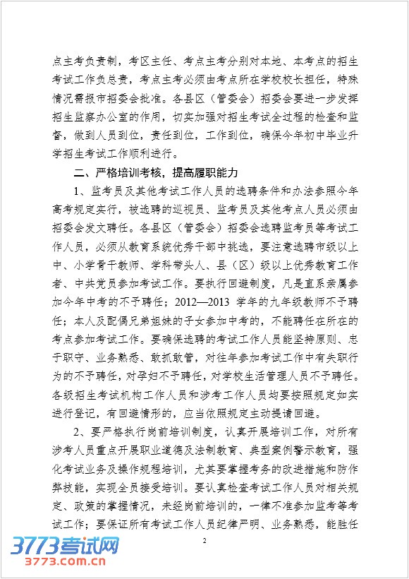 1、监考员及其他考试工作人员的选聘条件和办法参照今年高考规定实行,被选聘的巡视员、监考员及其他考点人员必须由招委会发文聘任。各县区(管委会)招委会选聘监考员等考试工作人员,必须从教育系统优秀干部中挑选,要注意选聘市级以上中、小学骨干教师、学科带头人、县(区)级以上优秀教育工作者、中共党员参加考试工作。要执行回避制度,凡是直系亲属参加今年中考的不予聘任;2012—2013学年的九年级教师不予聘任;本人及配偶兄弟姐妹的子女参加中考的,不能聘任在所在的考点参加考试工作。要确保选聘的考试工作人员能坚持原则、忠于职守、业务熟悉、敢抓敢管,对往年参加考试工作中有失职行为的不予聘任,对孕妇不予聘任,对学校生活管理人员不予聘任。各级招生考试机构工作人员和涉考工作人员均要按照规定如实进行登记,有回避情形的,应当依照规定主动提请回避。