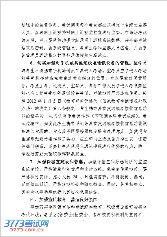 6、切实加强对手机或其他无线电通讯设备的管理。监考员与考生不得携带手机等通讯工具进入考场。监考员应在进入考场前将手机存放在主考室或考点指定的位置,考点要做好保管服务。考点主考、巡视员、监察员、考务工作人员在进入考点禁区前也应自觉将手机等通讯设备关闭,考试期间严禁违规使用。按照2012年1月5日《教育部关于修改〈国家教育考试违规处理办法〉的决定》第六条规定,考生携带具有发送或者接收信息功能的设备的,应当认定为考试作弊(即取消各科考试成绩)。考试过程中,如发现考生携带手机等具有发送或者接收信息功能设备进入考场的,考点及考区要按照规定提出处理意见。如发现考生携带无线传播作弊工具的,应立即向上级报告并与公安、保密等部门联系,坚决打击利用现代通讯手段进行作弊的行为,防止考题泄露或大面积作弊现象发生。