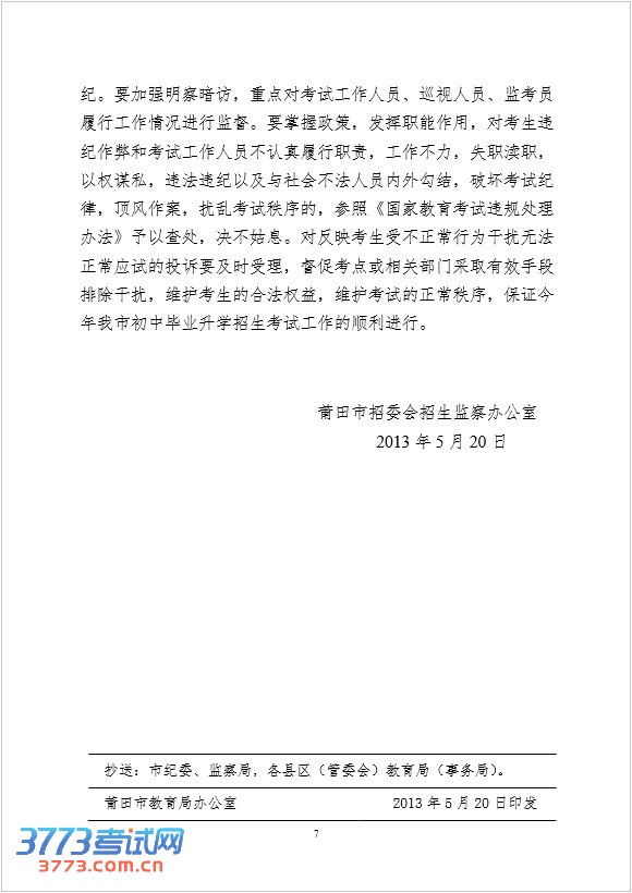 莆教[2013]监4号 关于做好莆田市2013年初中毕业升学招生考试考风考纪工作的通知