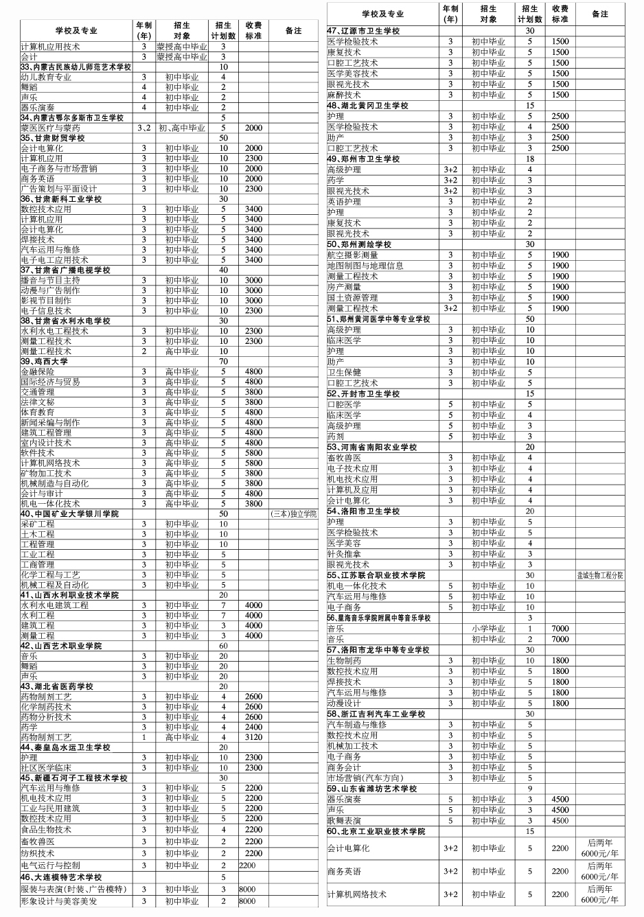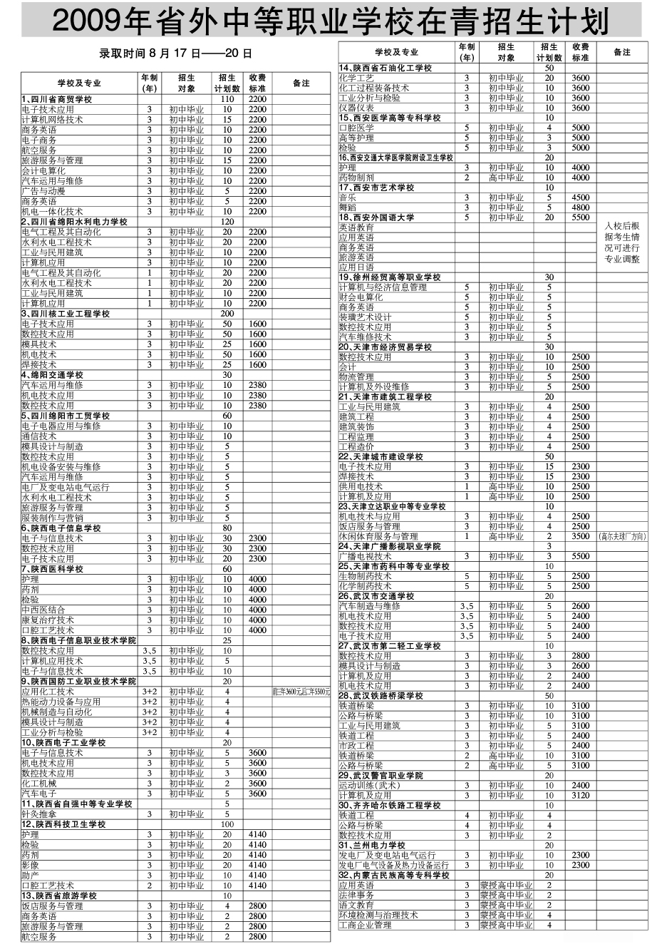 2009年青海省外中等职业学校在青招生计划