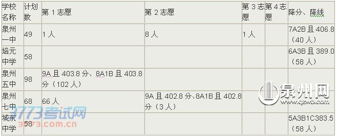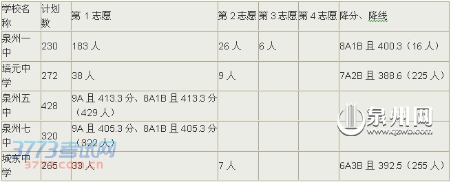 与去年相比,今年5所省一级达标中学的统招生录取线的等级和分数均有所下降,如录取分数最高的泉州五中统招线由去年的9A且415.8分降为9A或8A且413.3分。择校生入围控制线的等级和分数则上调,择校生入围控制线由去年的8A1C且355.8分调高为9A、8A1B且396分,泉州五中择校生录取线等级提高但分数有所下降,泉州一中、培元中学、泉州七中、城东中学择校生分数或等级比去年略有提高。