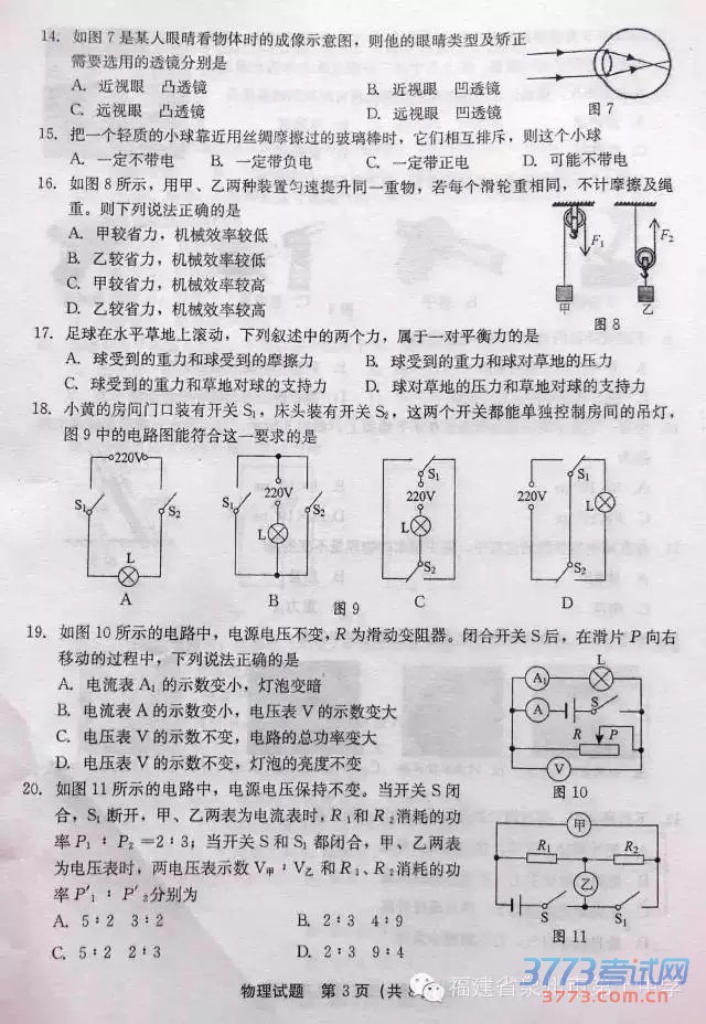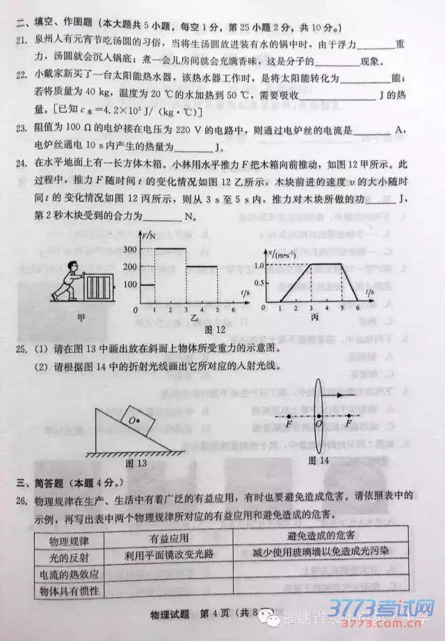[组图]2015泉州中考物理试题及答案评分标准