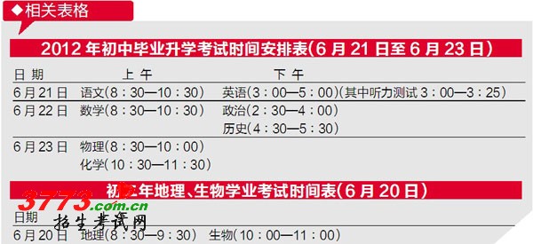 初中毕业升学考试,定于6月21日至6月23日举行。语文、数学、英语考试时间各120分钟,政治、物理考试时间各90分钟,化学、历史、地理、生物考试时间各60分钟。