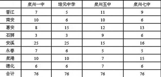 今年,泉州一中、培元中学、泉州五中、泉州七中面向鲤城、丰泽、洛江三区除外的县(市、区)各招收76名高一统招生(名额分配详见表格)。