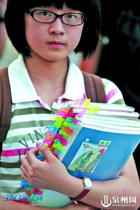昨日,一名考生捧着数本做满标记的书本备考。 (胡彦明 摄)