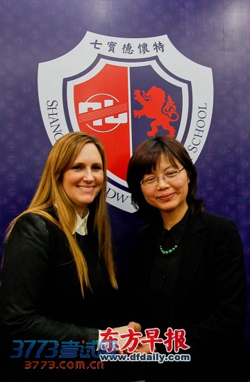 昨日,七宝德怀特高中的美方校长龙梅(左)与中方校长王芳握手。 早报记者 张栋 图