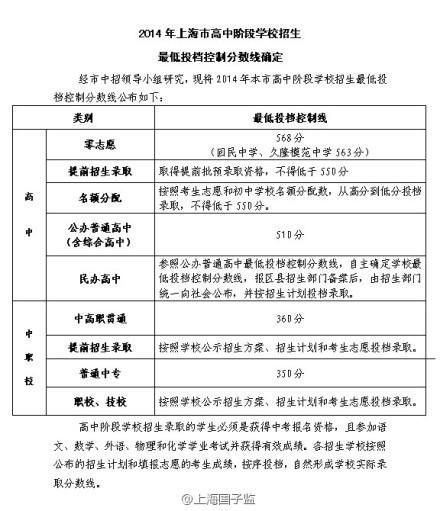 2014年上海市高中阶段学校招生最低投档控制分数线公布。零志愿:568分(回民中学、久隆模范中学563分);提前招生录取:取得提前批预录取资格,不得低于550分;名额分配:按照考生志愿和初中学校名额分配数,从高分到低分投档录取,不得低于550分;公办普通高中(含综合高中),510分;民办高中,参照公办普通高中最低投档控制分数线,自主确定学校最低投档控制分数线,报区县招生部门备案后,由招生部门统一向社会公布,并按招生计划投档录取。