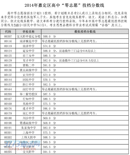 [图文]2014年上海嘉定区高中零志愿投档分数线