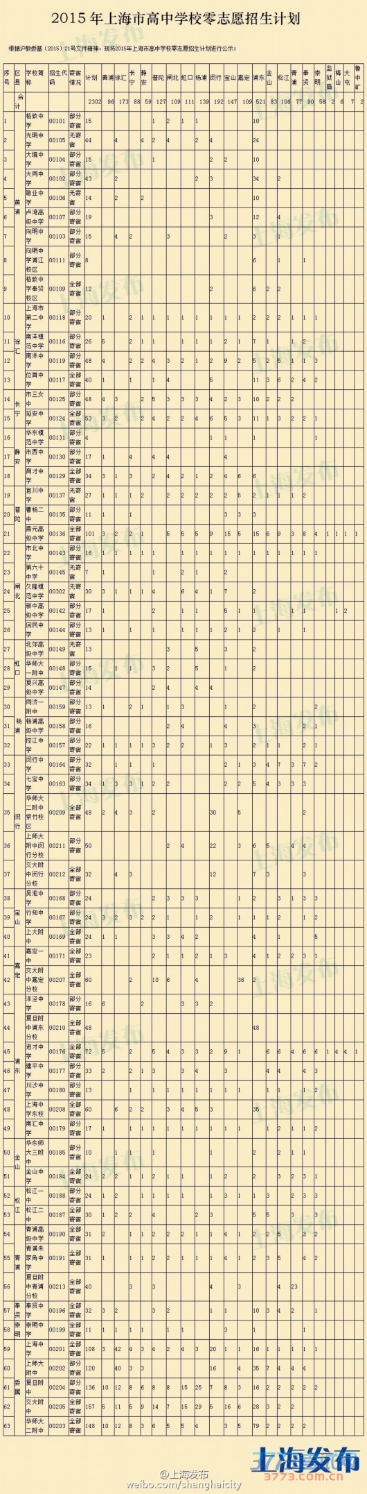 东方网5月13日消息:市教育考试院公布上中、复旦附中、交大附中、华师大二附中、上师大附中、格致中学、七宝中学、控江中学、建平中学等63所学校在各区县的零志愿招生名额,全市高中零志愿共计招收2302人。具体学校招生计划及寄宿情况见下文。