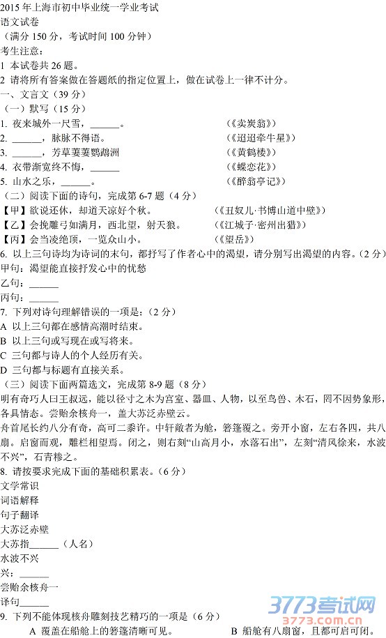 公布上海中考试题、答案和中考作文。祝各位考生都能取得好的成绩。2015年上海中考语文试题(图片版):