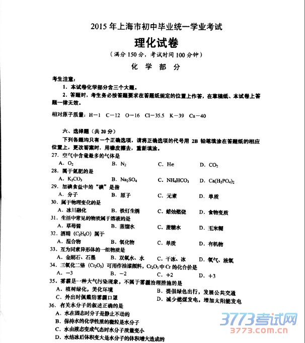 [组图]2015年上海中考化学试题发布