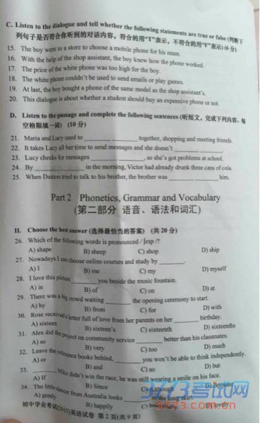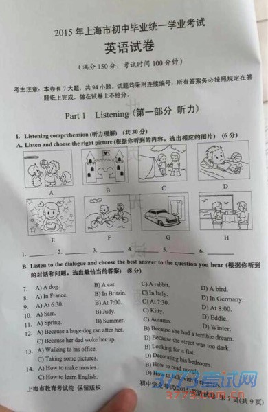 及时公布上海中考试题、答案和中考作文。祝各位考生都能取得好的成绩。2015年上海市中考英语试题(图片版):