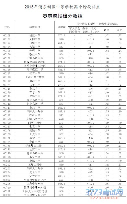 [图文]2015上海浦东新区中考零志愿投档分数线