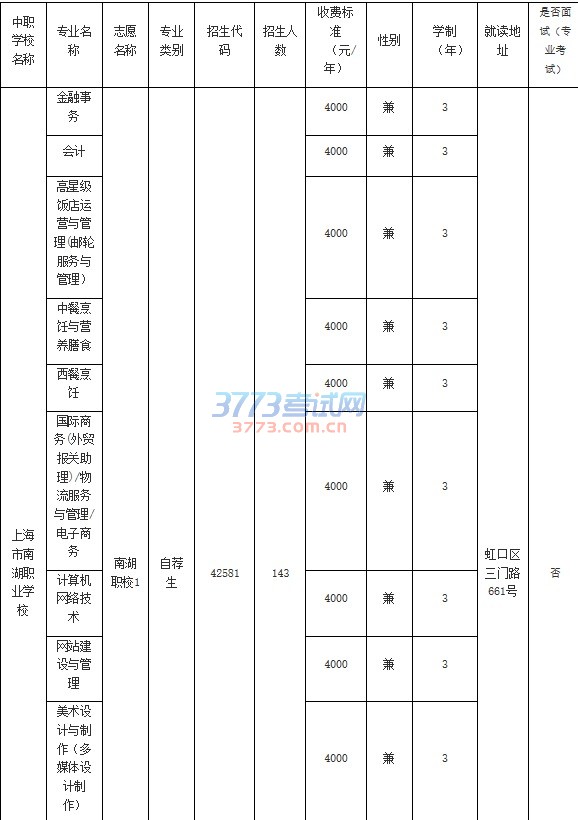 上海市南湖职业学校金融事务南湖职校1自荐生425811434000兼3虹口区三门路661号否