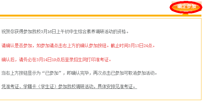 获得调研活动资格的同学,请确认!确认后,请于3月14日19点后登录招生网打印准考证,凭准考证和学生证(学籍卡)参加调研活动。