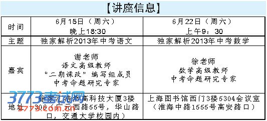 6月15日(周六)、22日(周六),昂立新课程教育按以往惯例,邀请市“示范性”中学一线教师,为初二学生和家长带来《第一时间:名师深度解析2013中考试题》系列讲座。