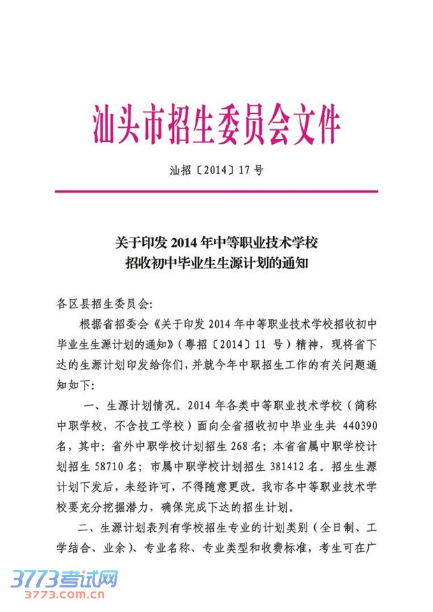 关于印发2014年中职学校招收初中毕业生生源计划的通知 下载