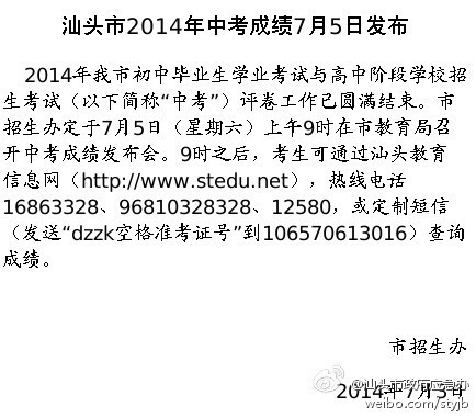 汕头市2014年中考成绩7月5日发布[话筒]】2014年我市中考评卷工作已圆满结束,市招生办定于7月5日(星期六)上午9时在市教育局召开中考成绩发布会。9时之后,考生可查询成绩。具体查询方式见下图。转告给身边的中考生吧