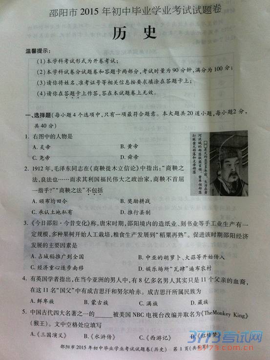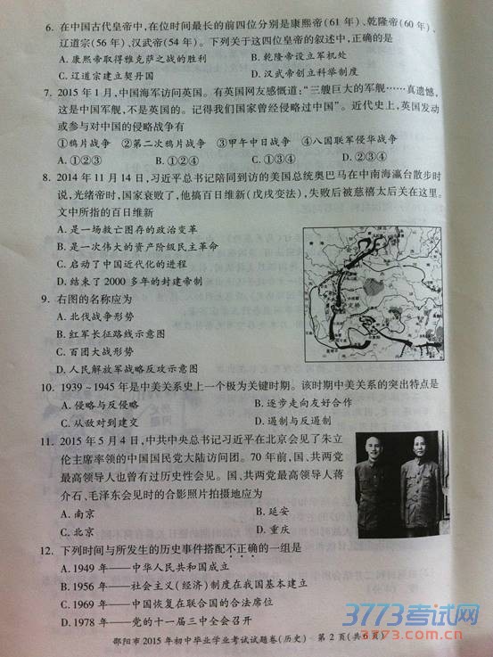 [组图]2015邵阳中考历史试题发布