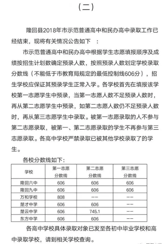 二、隆回一中统招线为909分,统招录取690人,隆回二中统招线为851分,统招录取658人,直升生录取110人。指标到校线见下表: