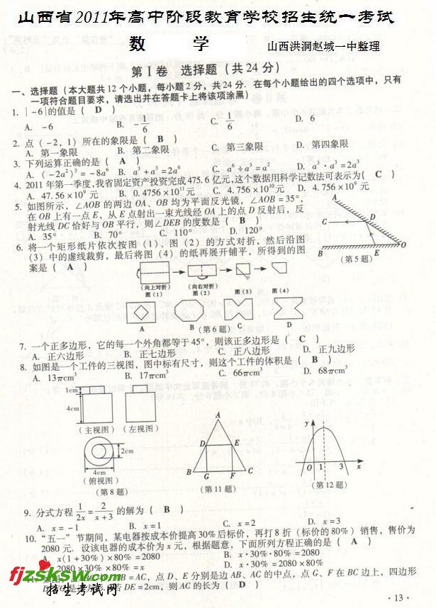 [组图]山西2011中考数学试题及答案