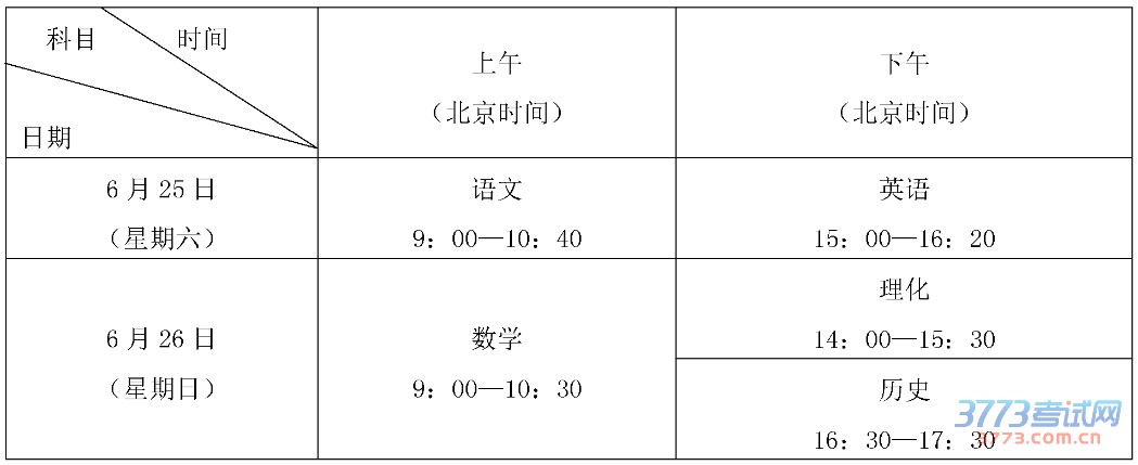体育考试于5月5-20日进行,英语听说考试于5月21-22日(星期六、日)进行(继续采用“人机对话”方式),语文、数学、英语、理化(合卷)、历史考试于6月25-26日(星期六、日)进行。语文100分钟,数学、理化各90分钟,英语80分钟,历史60分钟。具体安排如下: