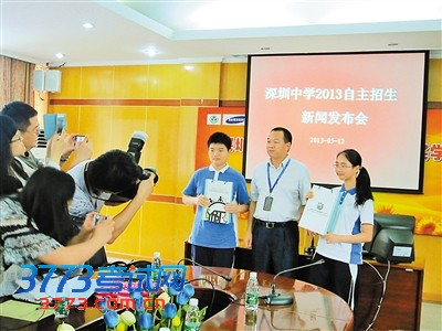 昨天,深中自主招生录取的学生代表——来自石厦学校的程小禾(女)及来自观澜二中的肖逸群,与副校长邢向钊一起接受记者采访。深圳商报记者 陈广琳 摄