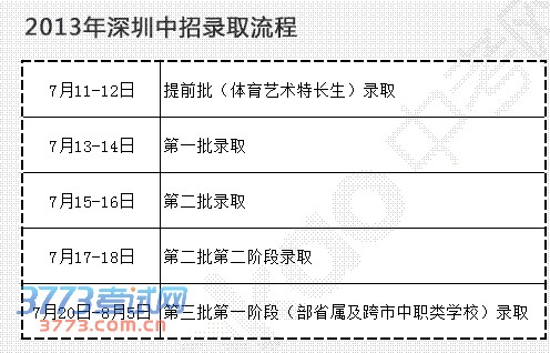 按照2013深圳中考中招日程安排,7月11-12日,将公布提前批(体育学校、艺术学校、高中学校体育艺术特长生)录取分数线,每批次录取结束后,考生可以网上查询个人录取结果。