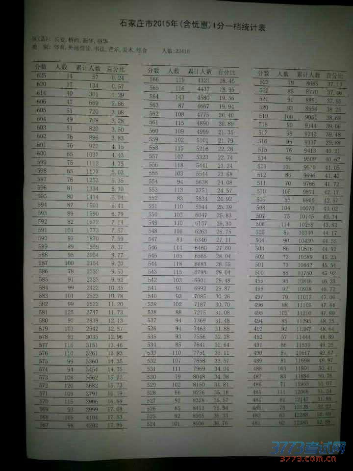 石家庄2015年中考一分一档统计表,群里看到的,不知是不是真的,大家看看吧!
