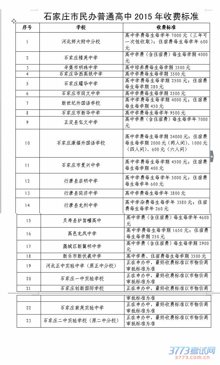 燕赵都市网讯(记者任利)民办普通高中招生的收费一直是关注的热点。今日(7月3日),石家庄市教育局公布了全市23所民办普通高中中18所学校招生收费的标准,其余5所学校的收费尚在申办中。前段时间,石家庄市教育局表示,为进一步回应社会关切,体现公开、公平、公正的原则,民办普通高中招生收费,严格执行经物价部门审核的收费标准,2015年石家庄市教育局统一向社会公布。