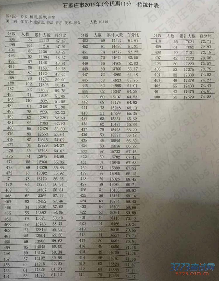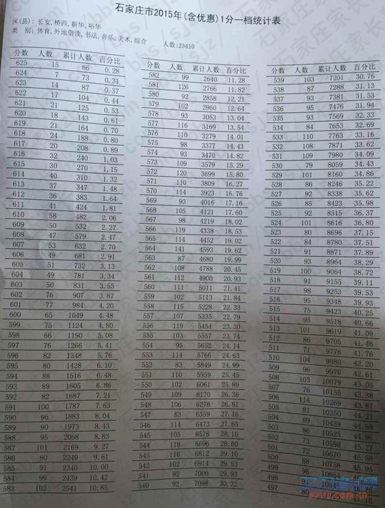 [组图]2015石家庄中考成绩1分一档统计表(市内四区)