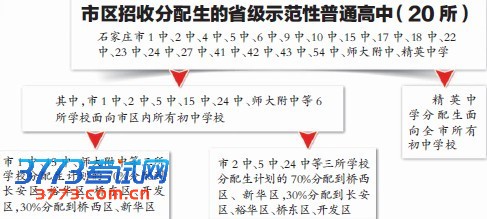注:市内五区、开发区属省级示范性普通高中分配生招生范围,以京广铁路为界,铁路以西的学校面向桥西区、新华区范围内初中学校招生;铁路以东的高中学校面向开发区、长安区、裕华区、桥东区范围内初中学校招生。