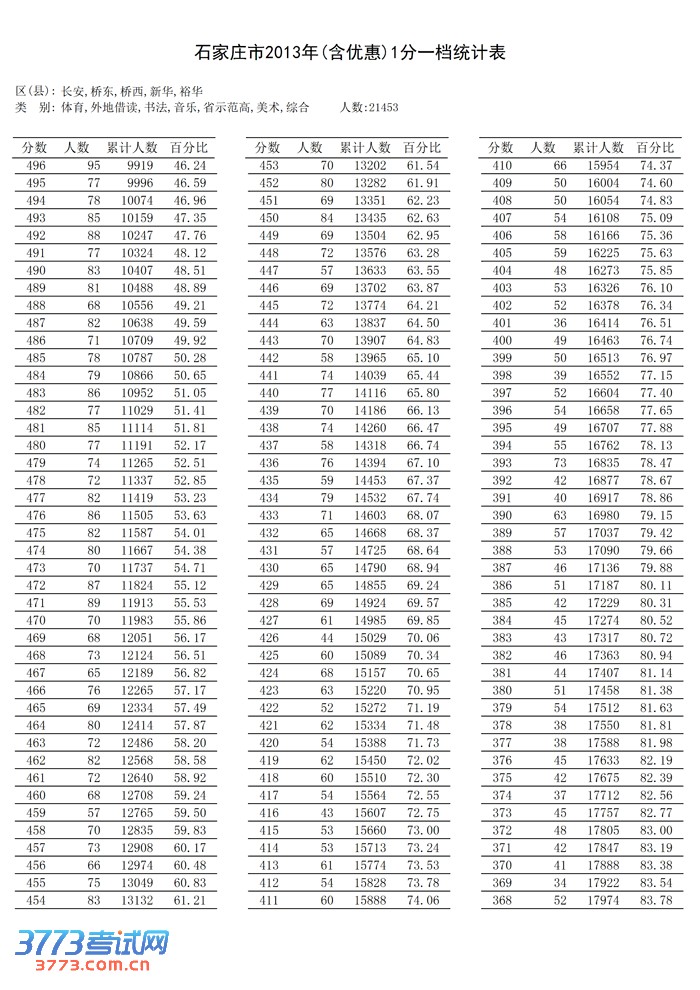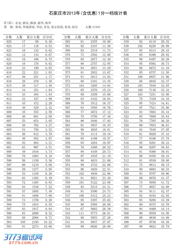 [组图]2013石家庄中考成绩1分一档统计表(市内五区)