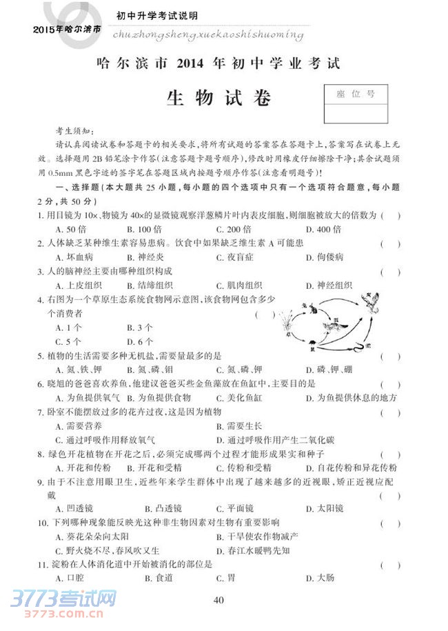 2015哈尔滨中考生物试卷及答案