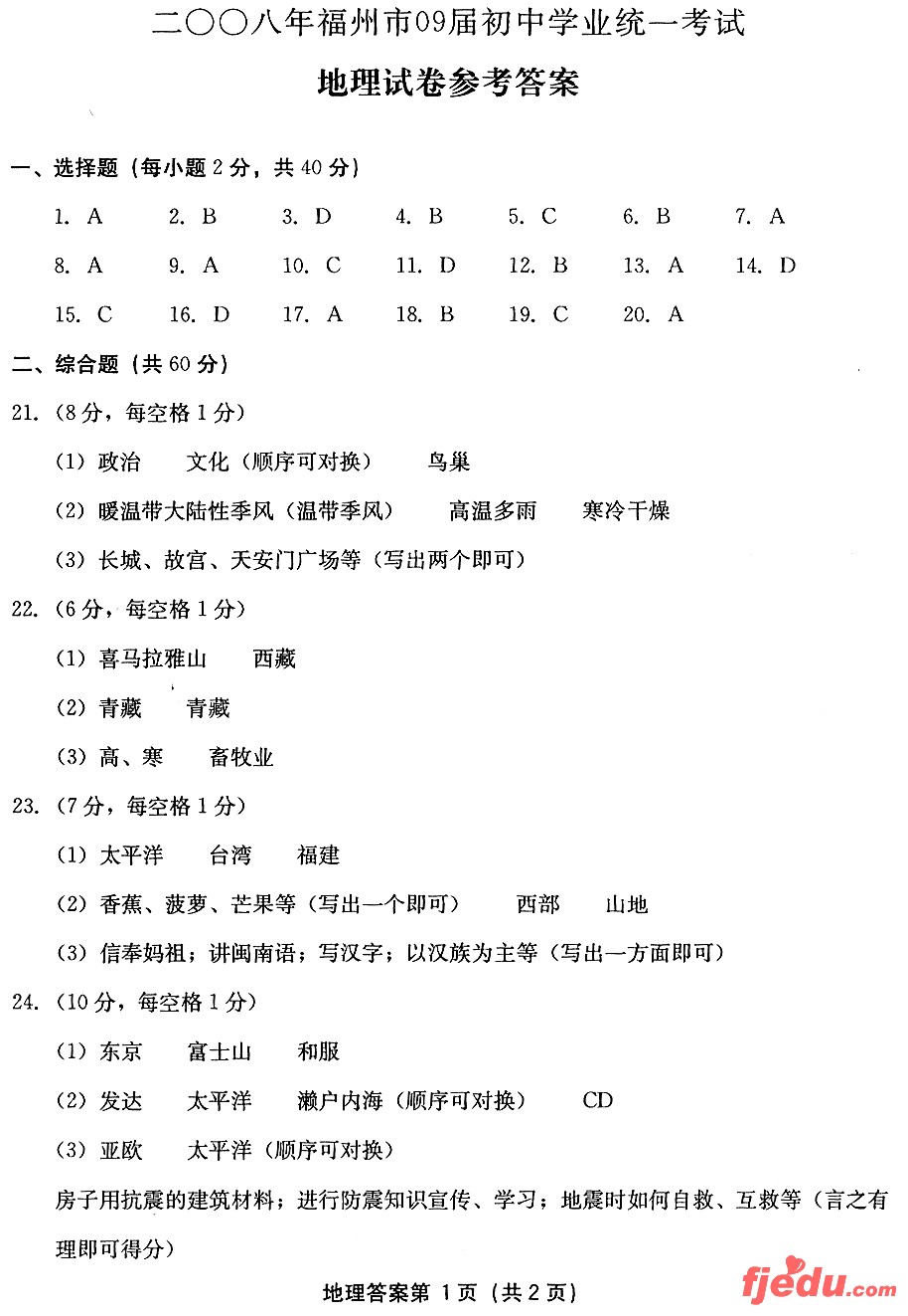 [组图]2008年福州中考地理试卷及答案