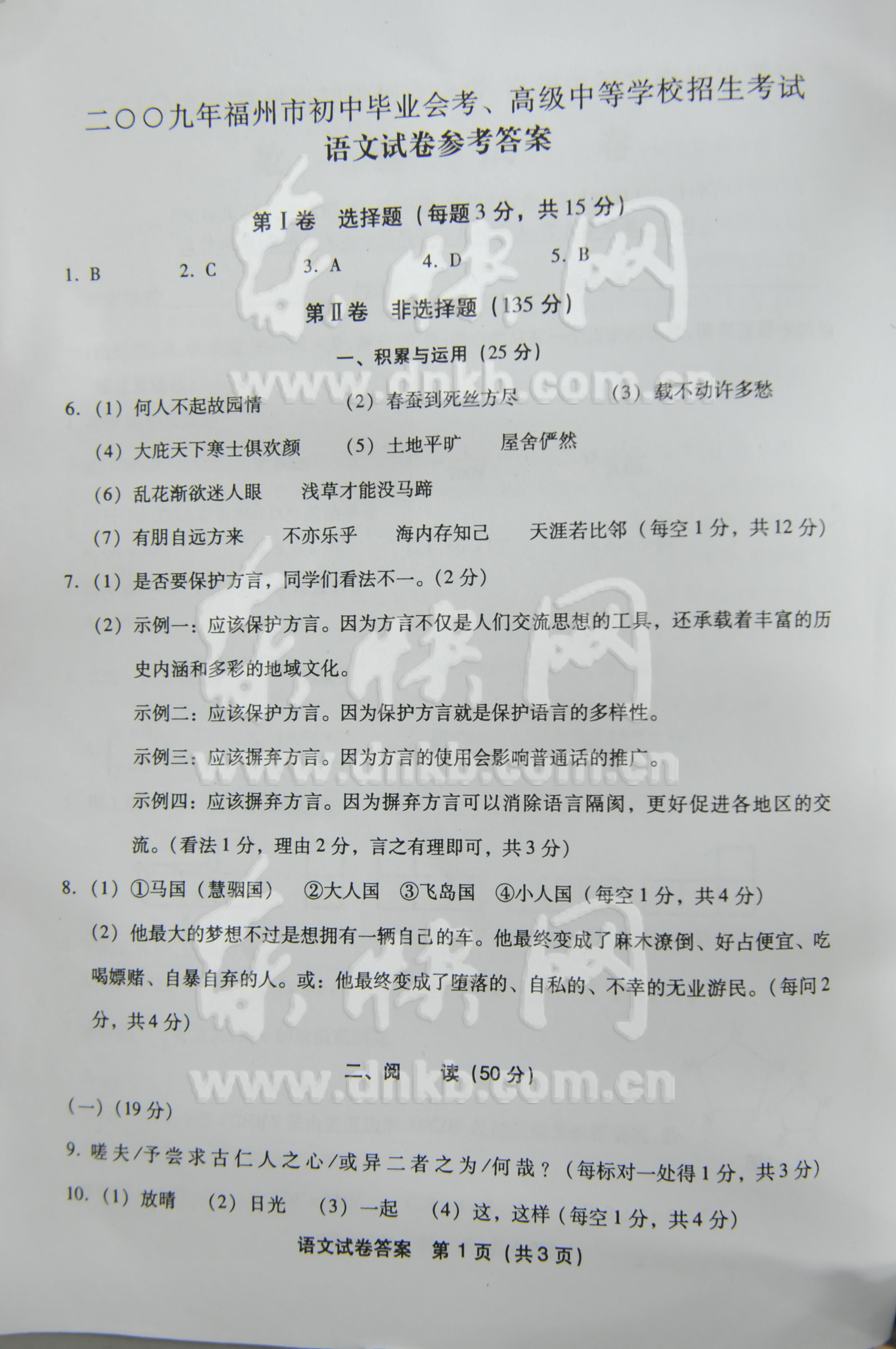 [组图]2009年福州市中考语文试题卷及答案