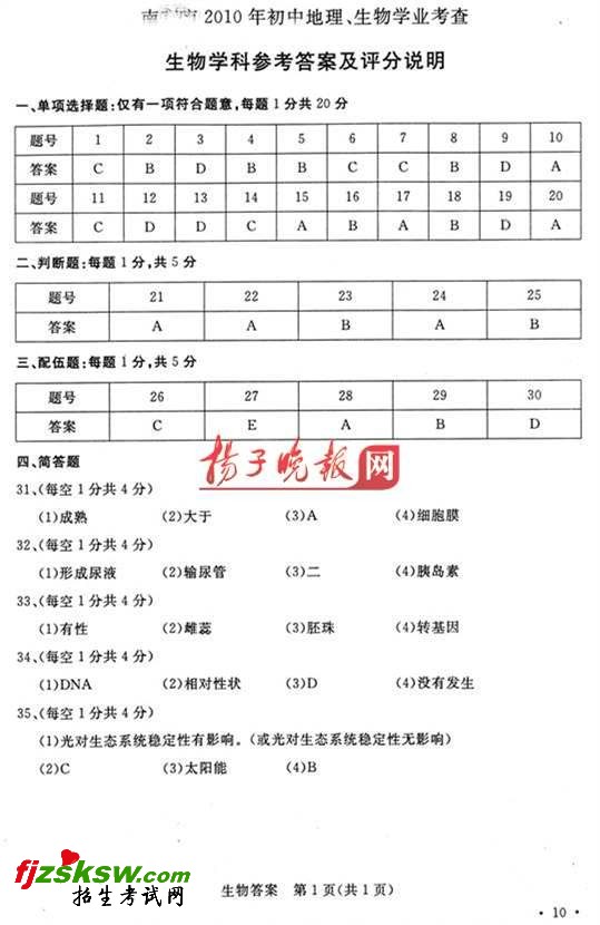 [组图]2010年南京市生物学业考查试题及答案