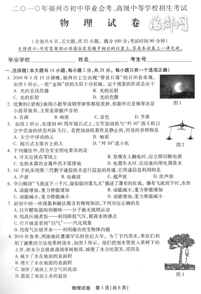 [组图]2010年福州中考物理试题答案下载