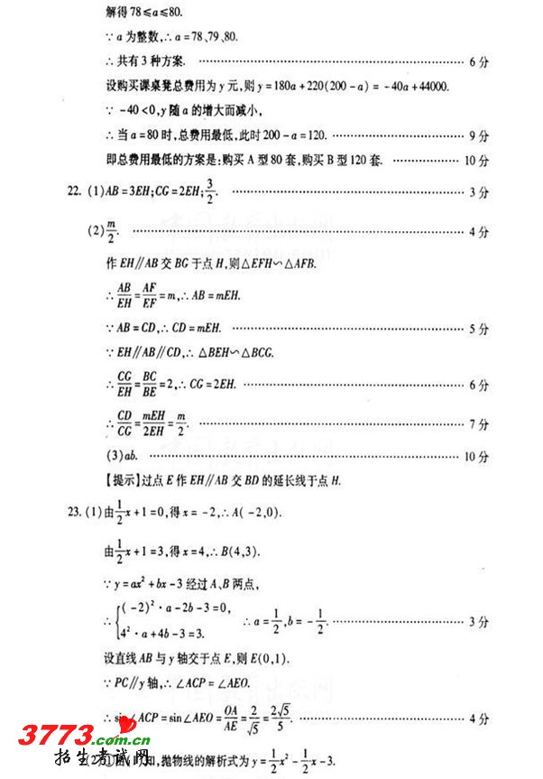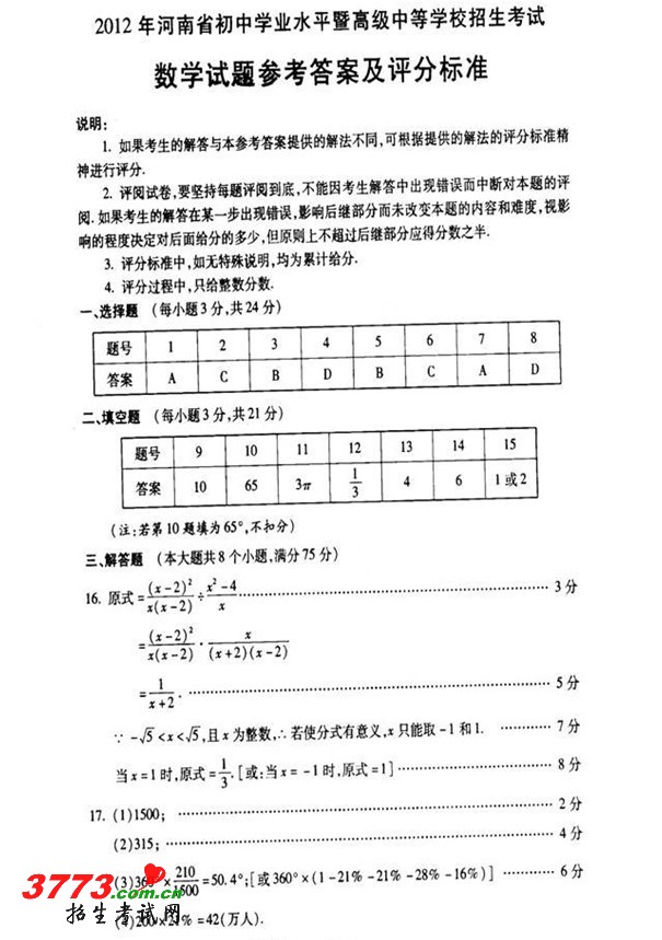 [组图]2012年河南省中招考试数学试卷真题答案及评分标准